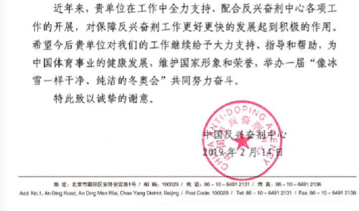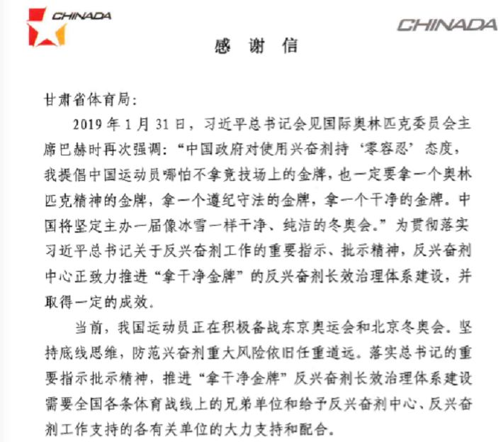 日前,中国反兴奋剂中心向甘肃省体育局发来感谢信,对甘肃省体育局反兴奋剂工作予以支持和肯定!